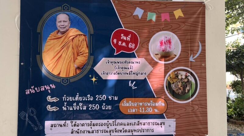 เมื่อเวลา 09.00 น. วันที่ 4 ธันวาคม 2568 ท่านเจ้าคุณแจ้ หรือ พระวชิรคณาทร เจ้าอาวาสวัดบางพลีใหญ่กลาง ได้เมตตาเป็นเจ้าภาพเลี้ยงก๋วยเตี๋ยวปทุมทองเป็นอาหารกลางวันแก่ทีมแพทย์ พยาบาล และเจ้าหน้าที่โรงพยาบาลบางพลี อำเภอบางพลี จังหวัดสมุทรปราการ รวมจำนวน 1,000 ถ้วย เพื่อถวายเป็นพระราชกุศลแด่สมเด็จพระนางเจ้าสิริกิติ์ พระบรมราชินีนาถ พระบรมราชชนนีพันปีหลวง โดยมีคณะเจ้าหน้าที่ตำรวจ สภ.บางพลี ร่วมเดินทางไปด้วย
