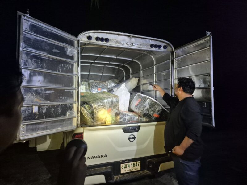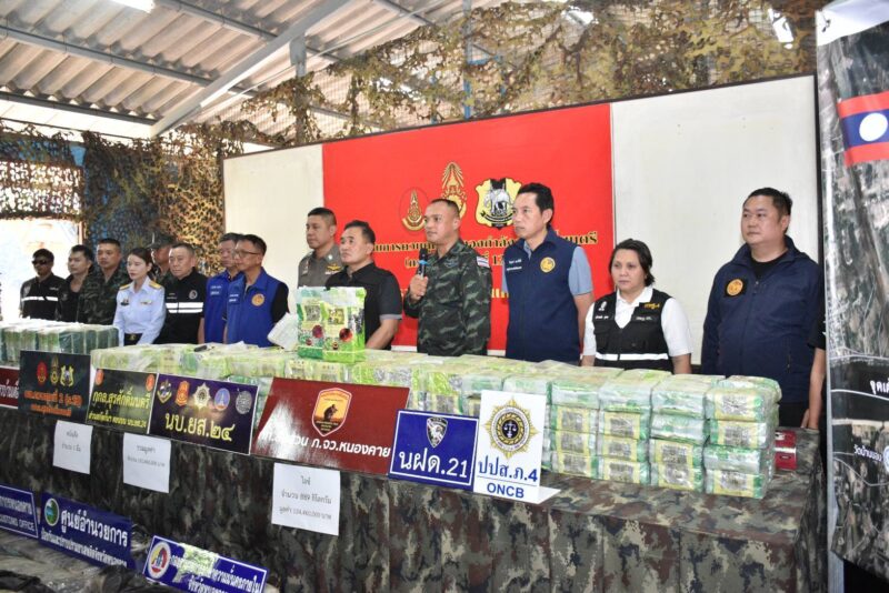 เมื่อ 5 ธ.ค. 68 เวลา 13.30 น.ที่ฐานปฏิบัติการ หน่วยเฝ้าตรวจชายแดนที่ 21 บก.ควบคุมที่ 2 กองกำลังสุรศักดิ์มนตรี โรงเรียนบ้านดงเวร ต.หินโงม อ.เมืองหนองคาย จ.หนองคาย นายศรัณศักด์ ศรีเครือเนตร ผู้ว่าราชการจังหวัดหนองคาย , นายไพฑูรย์ มหาชื่นใจ รองผู้ว่าราชการจังหวัดหนองคาย , พ.อ.เรวัฒ ธรรมจิรเดช เสธ.กองกำลังสุรศักดิ์มนตรี , พล.ต.ต.อัทธชนม์ ช่วงงาม ผบก.จ.หนองคาย , พ.อ.วีรเทพ การุณรอบดุล รอง ผอ.รมน.จังหวัด น.ค.(ท.) , นายประทีป อุ่ยเจริญ ปลัดจังหวัดหนองคาย พร้อมหน่วยงานที่เกี่ยวข้อง ได้ร่วมกันแถลงข่าวการจับกุมครั้งนี้ สืบเนื่องจากเมื่อวันที่ 1 ธันวาคม 2568 หน่วยเฝ้าตรวจชายแดนที่ 21 ได้รับรายงานด้านการข่าวจาก ชุดปฏิบัติการข่าวที่ 3 กองกำลังสุรศักดิ์มนตรี ได้ทราบว่ามีความเคลื่อนไหวจากกลุ่มนัก ค้ายาเสพติด ในพื้นที่ บ้านควายแดง เมืองหาดทรายฟอง เขตนครหลวงเวียงจันทน์ ฝั่งตรงข้าม บ้านบอน หมู่ 4 ตำบลหาดคำ อำเภอเมืองหนองคาย จังหวัดหนองคาย ว่าจะมีการขนย้ายยาเสพติดข้ามมายังฝั่งไทย ในห้วงวันที่ 2-5 ธันวาคม 2568