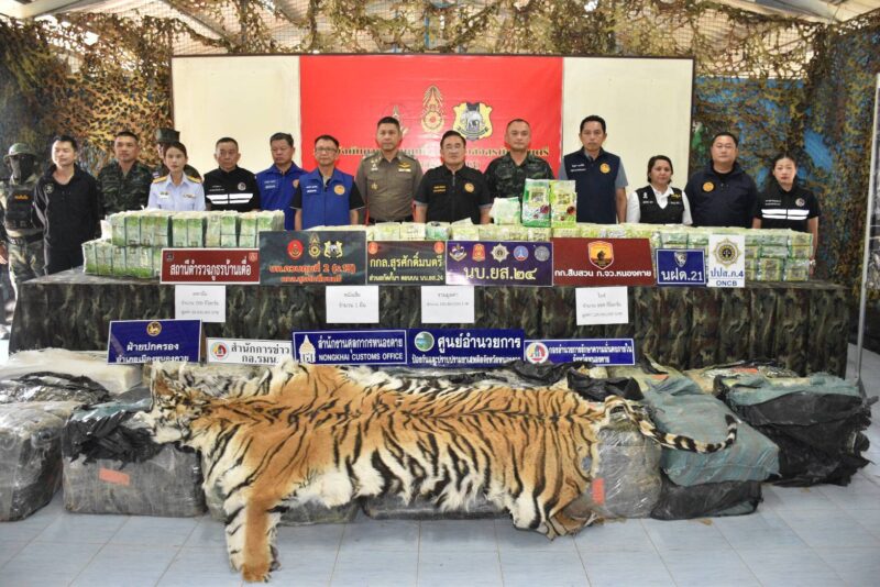 4 ตำบลหาดคำ อำเภอเมืองหนองคาย จังหวัดหนองคาย ซึ่งคาดว่าจะใช้ลำเลียงยาเสพติด ผ่านเข้ามาในพื้นที่ จนกระทั่งวันที่ 5 ธันวาคม 2568 เวลา 02.30 น. อยู่หลวง หมายเลข 212 มุ่งหน้าไปยังทางทิศตะวันออก จึงแจ้งให้ชุดสกัดกั้น (หน่วยเฝ้าตรวจชายแดนที่ 21 ร่วมกับ กองกำกับการสืบสวน ตำรวจภูธรจังหวัดหนองคาย) ทำการสกัดกั้นตรวจสอบรถคันดังกล่าว และเมื่อเวลา 03.20 ณ ชุดสกัดกั้น ตรวจพบรถยนต์ต้องสงสัย บริเวณปากทางเข้าบ้านดงเวร ตำบลสีกาย อำเภอเมืองหนองคาย จังหวัดหนองคาย จึงได้ทำการขอตรวจค้นภายในรถ พบกระสอบ ข้างในบรรจุยาเสพติดประเภท 1 (ไอซ์) รวมทั้งสิ้นจำนวน 889 กก. (กระสอบสีดำ 20 กระสอบ กระสอบสีขาว 2 กระสอบ) เคตามีน 200 กก. บรรจุในกระสอบสีขาว จำนวน 5 กระสอบ ซากหนังเสือจำนวน 1 ผืน และรถยนต์ จำนวน 1 คัน และผู้ต้องหาที่เป็นคนขับรถ 1 ราย ทราบชื่อต่อมาคือนายคมสัน อายุ 28 ปี ภูมิลำเนาจังหวัดหนองคาย ตรวจยึดยาเสพติดทั้งหมดและควบคุมตัวผู้ต้องหามา ที่ฐานปฏิบัติการ หน่วยเฝ้าตรวจชายแดนที่ 21 บก.ควบคุมที่ 2 เพื่อสอบปากคำเบื้องต้นและทำบันทึกการจับกุม