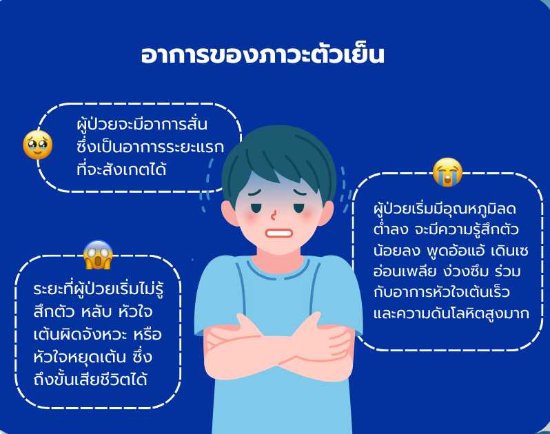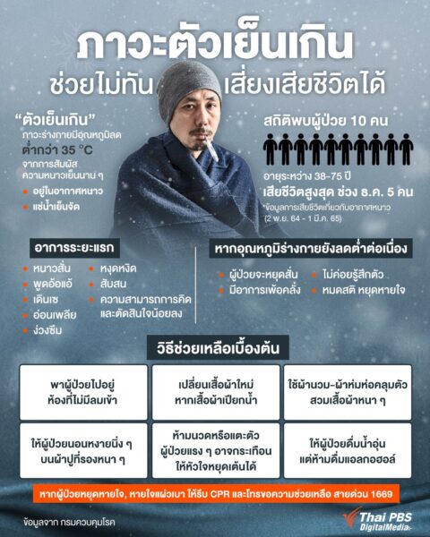 จากข้อมูลกรมควบคุมโรค กระทรวงสาธารณสุข ช่วงนี้ประเทศไทยมีอุณหภูมิเริ่มลดลง ส่งผลให้มีอากาศหนาวเย็น โดยเฉพาะภาคเหนือและภาคตะวันออกเฉียงเหนือ อาจส่งผลให้ประชาชนอาจมีอาการ “ภาวะตัวเย็นเกิน” หรือ “ไฮโปเธอร์เมีย (Hypothermia)” ซึ่งเป็นภาวะที่ร่างกายมีอุณหภูมิลดต่ำ จากการสัมผัสความหนาวเย็นเป็นเวลานาน เช่น อยู่ในอากาศหนาว หรือแช่ในน้ำที่เย็นจัด ทำให้ร่างกายสูญเสียกลไกการปรับอุณหภูมิ ไม่สามารถสร้างและเก็บความร้อนในร่างกายได้ ส่งผลให้อุณหภูมิของร่างกายลดต่ำกว่า 35 องศาเซลเซียส เป็นเหตุให้อวัยวะต่างๆ โดยเฉพาะหัวใจและสมองทำงานผิดปกติ ก่อให้เกิดอาการเจ็บป่วยรุนแรงไปจนถึงเสียชีวิตได้ ในระยะแรกผู้ป่วยจะมีอาการหนาวสั่น พูดอ้อแอ้ เดินเซ งุ่มง่าม อ่อนเพลีย ง่วงซึม หงุดหงิด สับสน ความสามารถในการคิดและตัดสินใจน้อยลง หากอุณหภูมิร่างกายยังลดต่ำอย่างต่อเนื่องผู้ป่วยจะหยุดสั่น มีอาการเพ้อคลั่ง ไม่ค่อยรู้สึกตัว หมดสติและหยุดหายใจในที่สุด