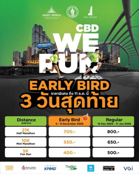 ใจกลางเมือง “CBD WE RUN 2026 – วิ่งสร้างสรรค์ รักษ์กันกรุงเทพมหานคร” ที่จะจัดขึ้น วันอาทิตย์ที่ 18 มกราคม 2569 เวลา 04.00 – 07.00 น. ณ จุดปล่อยตัว อาคาร ‘เอ็มไพร์’ รายได้หลังหักค่าใช้จ่ายสมทบทุนโครงการ “ปัน สุข” ของมูลนิธิแอทเสท เวิรด์ เพื่อการกุศล เพื่อรักษาสิ่งแวดล้อมของชุมชน กรุงเทพมหานคร และประเทศไทย
