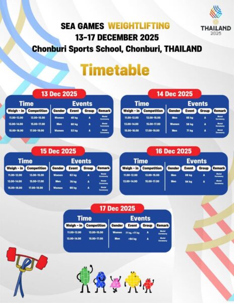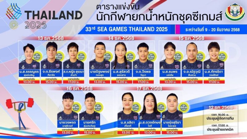 การแข่งขันกีฬายกน้ำหนักในมหกรรมซีเกมส์ครั้งที่ 33 มีกำหนดชิงชัยระหว่างวันที่ 13-17 ธันวาคม 2568 ที่โรงยิมเนเซี่ยม โรงเรียนกีฬาจังหวัดชลบุรี แบ่งการแข่งขันเป็นหญิง 7 รุ่น และชาย 7 รุ่น ทั้งนี้ทีมไทยส่งนักกีฬาชิงชัยครบทุกรุ่น โดยวันแรกของการชิงเหรียญทองยกน้ำหนัก 3 รุ่น 3 เหรียญทอง นางสาวธรรญธร สุขข์เจริญ จะขึ้นเวทีเป็นคนแรกของทีมในวันที่ 13 ธันวาคม 2568 เวลา 13.00 น. รุ่น 48 กิโลกรัมหญิง จากนั้นเวลา 15.00 น. รุ่น 60 กิโลกรัมชาย จ่าตรีธีรพงศ์ ศิลาชัย เจ้าของเหรียญเงินโอลิมปิก 2024 และ เวลา 17.00 น. รุ่น 53 กิโลกรัมหญิง สิบตรีหญิง สุรจนา คำเบ้า เจ้าของเหรียญทองแดงโอลิมปิก 2024