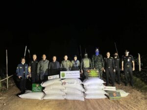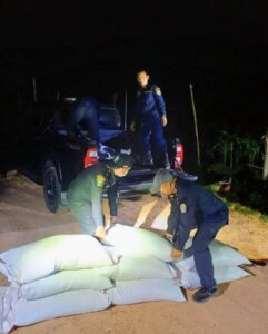 ต่อมาเจ้าหน้าที่ได้ลงพื้นที่ที่ได้รับแจ้งพบกลุ่มชายฉกรรจ์ประมาณ 10-15 คน กำลังแบกกระสอบสีขาว จึงได้ส่งสัญญานให้หยุด เมื่อกลุ่มชายฉกรรจ์พบเห็นเจ้าหน้าที่ ได้ทิ้งกระสอบดังกล่าว แล้ววิ่งหลบหนี อาศัยความมืดและชำนาญพื้นที่หลบหนีไปได้ ตรวจสอบบริเวณรอบๆ พบกระสอบข้าวสาร จำนวน 14 กระสอบ น้ำหนักประมาณ 700 กิโลกรัม