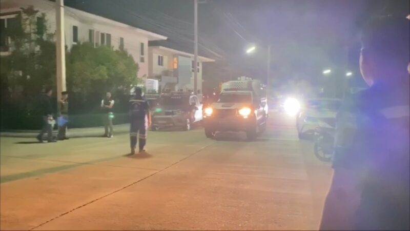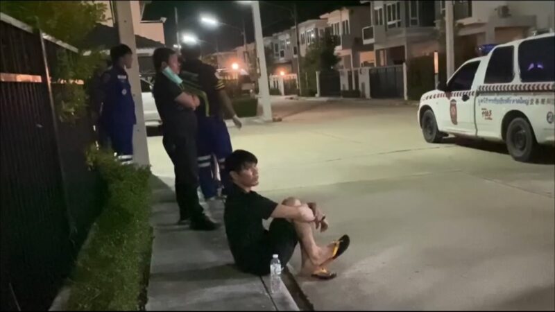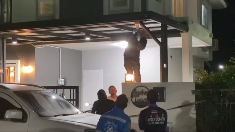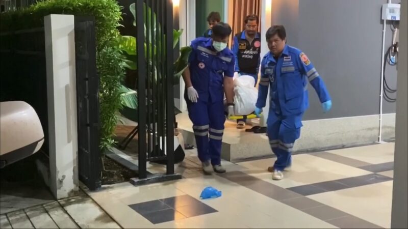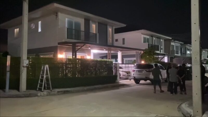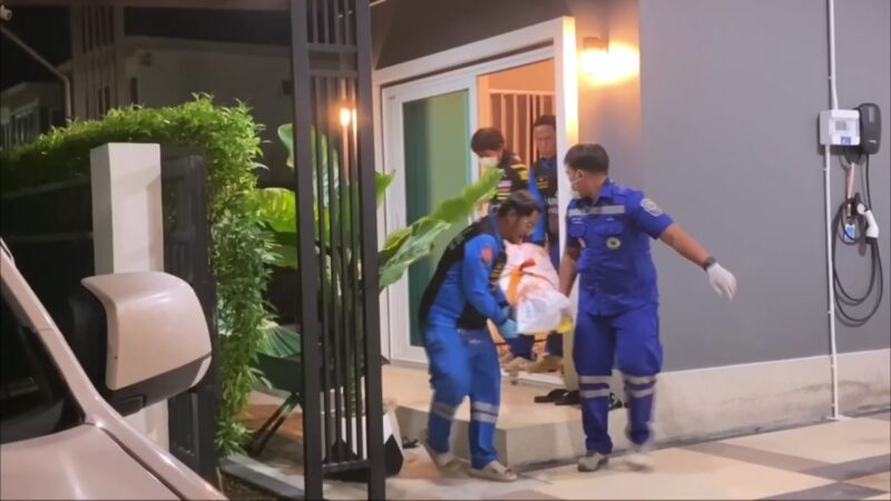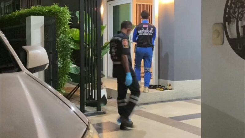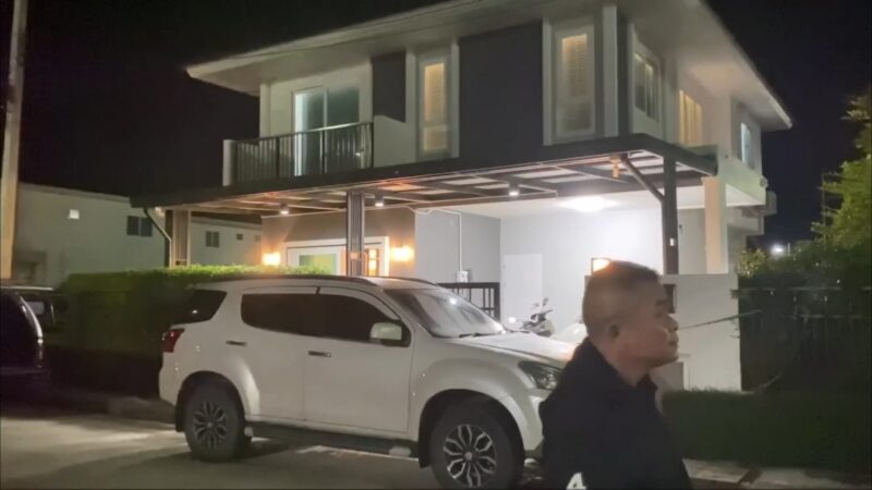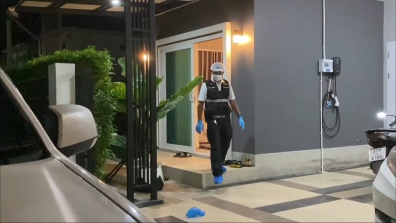 ที่เกิดเหตุภายในหมู่บ้านพบเป็นบ้านพักส่วนตัว 2 ชั้น ตรวจสอบห้องนอนชั้น 2 พบศพผู้เสียชีวิตเป็นชาย 1 ราย และหญิง 1 ราย อยู่ในสภาพนอนกอดกัน เบื้องต้นทั้งคู่อายุ 44 ปี เป็นสามีภรรยากัน ตรวจสอบสภาพศพฝ่ายชายที่บริเวณขมับขวาพบรอยรูกระสุนปืนจำนวน 1 รู นอนทับบนตัวผู้หญิงในท่านอนกอด ตรวจสอบสภาพศพฝ่ายหญิงที่บริเวณขมับขวา พบรอยรูกระสุนปืนจำนวน 3 รู จากการตรวจสอบโดยรอบพบปลอกกระสุนปืน 9 มม. ตกอยู่ที่พื้นห้องนอน จำนวน 4 ปลอก เจ้าหน้าที่กองพิสูจน์หลักฐาน 9 จึงได้ตรวจยึดเก็บไว้เป็นหลักฐาน