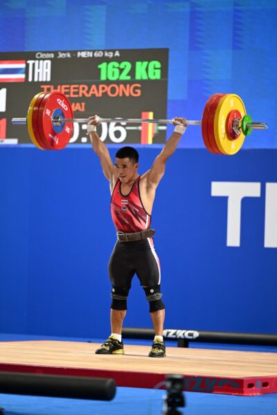 รุ่น 60 กิโลกรัม ชาย แข่งขันรวม 6 คน ทีมไทยส่ง “ฟ่าง” จ่าตรี ธีรพงศ์ ศิลาชัย เจ้าของเหรียญเงินโอลิมปิกเกมส์ “ปารีส 2024“ ลงชิงชัย โดยท่าสแนทช์ ยกผ่าน 3 ครั้งรวด 126 กิโลกรัม, 129 กิโลกรัม, 131 กิโลกรัม ตามลำดับ/ ท่าคลีนแอนด์เจิร์ก ธีรพงศ์ ออกมายกด้วยความมั่นใจ ท่ามกลางเสียงเชียร์ของแฟนกีฬาชาวไทย ครั้งแรกยกผ่านที่ 162 กิโลกรัม, ครั้งที่ 2 ยกผ่านที่ 165 กิโลกรัม จากนั้นครั้งที่ 3 เรียกเหล็ก 173 กิโลกรัม ยกผ่านสำเร็จ พร้อมทุบสถิติโลกที่วางมาตรฐานไว้ 172 กิโลกรัม ไปแบบสะใจกองเชียร์ รวมทั้งขยับน้ำหนักรวมไปอยู่ที่ 304 กิโลกรัม ผงาดคว้าเหรียญทองแรกให้กับทัพจอมพลังไทย