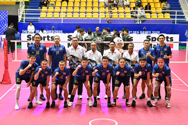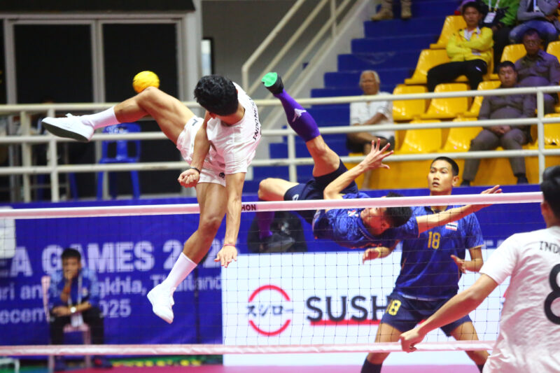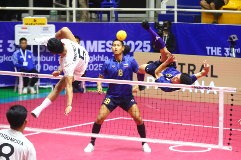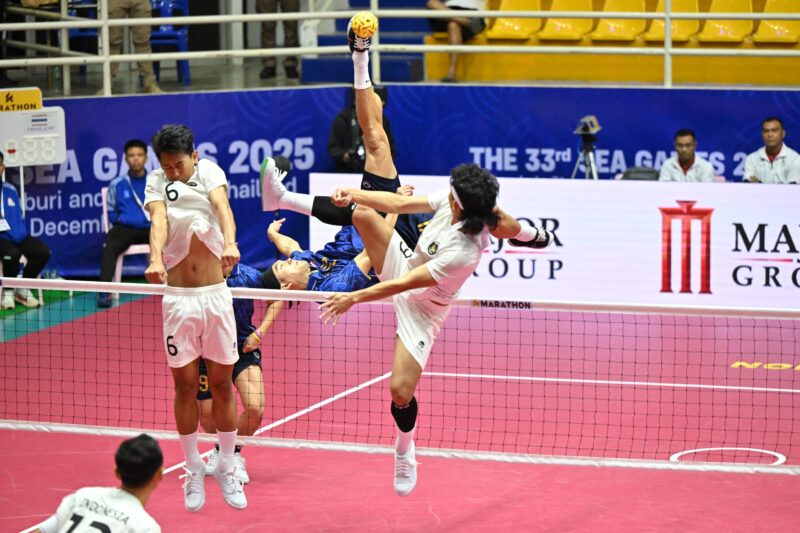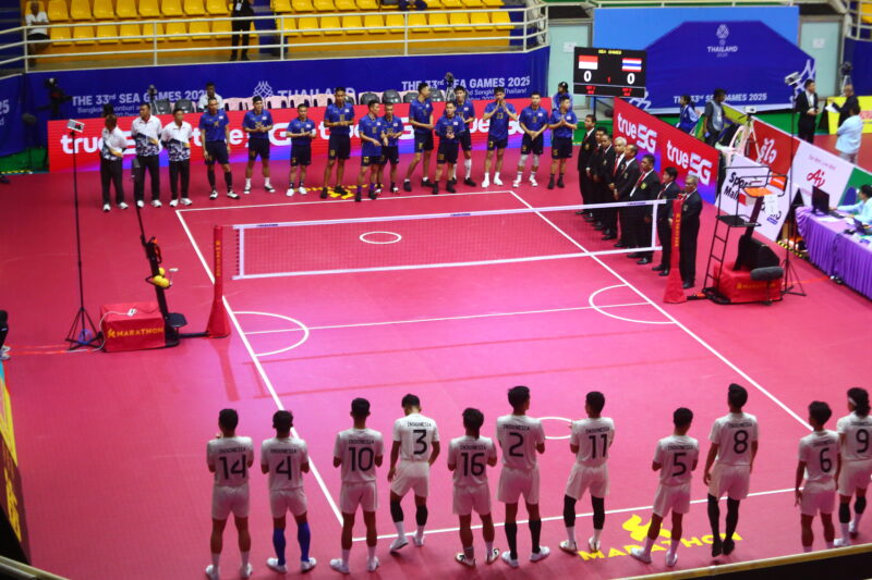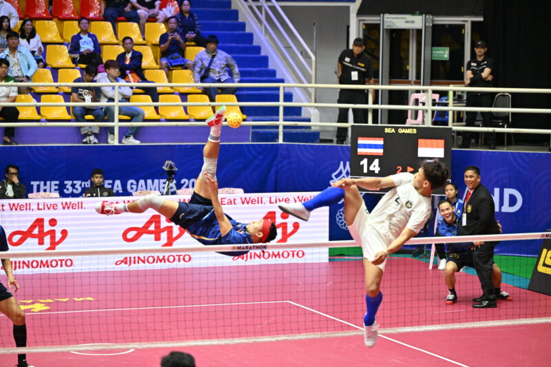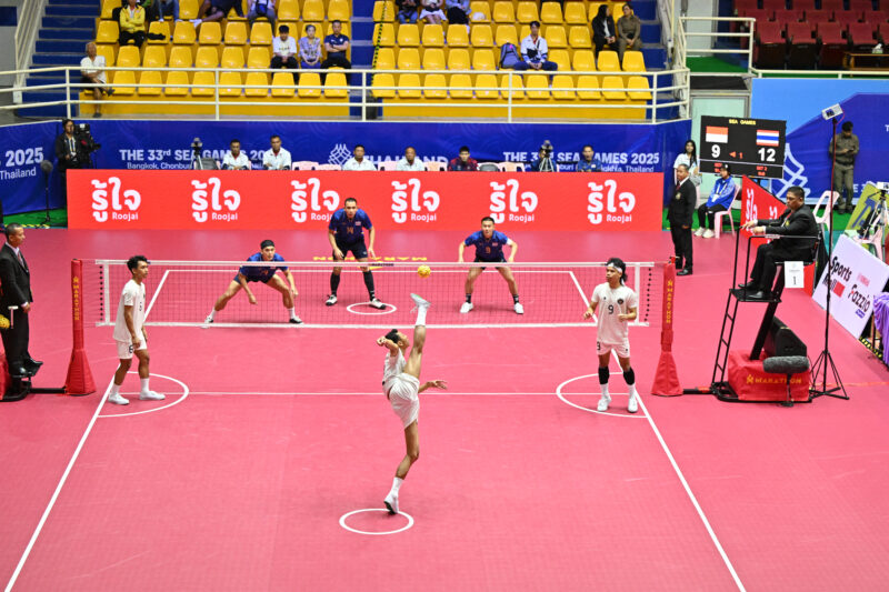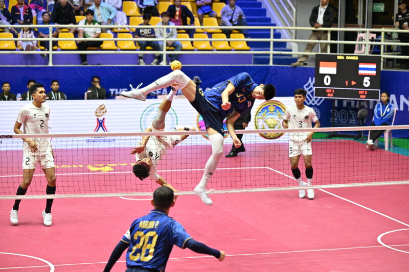 การแข่งขันตะกร้อทีมชุดชาย รอบแรก กลุ่มบี กีฬาซีเกมส์ ครั้งที่ 33 ที่สนามโรงยิมเนเซียม 4,000 ที่นั่ง ศูนย์กีฬาเทศบาลนครนครปฐม ทีมไทยลงเล่นนัดสุดท้ายพบกับอินโดนีเซีย