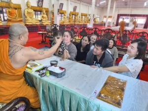 นักท่องเที่ยวสายมูให้ความศรัทธาเดินทางมาวัดหลวงพ่อปากแดงเข้าพิธีนอนโลงศพสะเดาะเคราะห์ต่อดวงชะตาชีวิต ฝึกตายก่อนตายจริงฝึกสติให้คิดได้ว่าทุกคนหนีไม่พ้นความตาย พร้อมเจิมหน้าผาก เจิมฝ่ามือ ลงยันต์กระเป๋าสตางค์ ลงยันต์โทรศัพท์