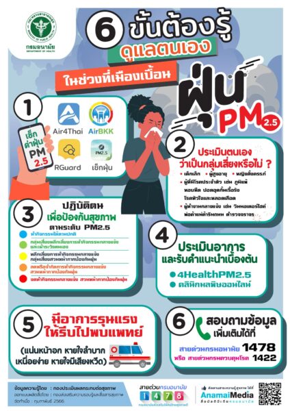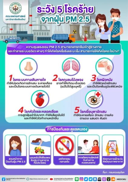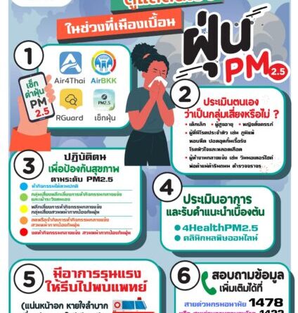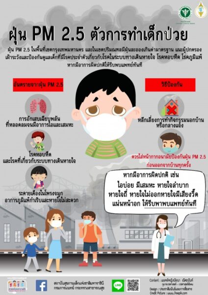 จากข้อมูลกรมควบคุมโรค กระทรวงสาธารณสุข พบว่า ปัจจุบันฝุ่น PM 2.5 มีแนวโน้มเพิ่มขึ้นอย่างต่อเนื่องทั่วทั้งประเทศ ซึ่งมีสาเหตุเกิดจากการเผาป่า และไฟป่า มลพิษ ควันจากท่อไอเสียของรถยนต์ โรงงานอุตสาหกรรม การก่อสร้าง ซึ่งส่งผลกระทบต่อสุขภาพของประชาชนโดยเฉพาะกลุ่มเสี่ยง ได้แก่ 1) เด็กเล็ก คือ เด็กแรกเกิด – 5 ปี เนื่องจากระบบป้องกันและภูมิคุ้มกันของร่างกายยังพัฒนาได้ไม่ดีเหมือนผู้ใหญ่ 2) หญิงตั้งครรภ์ โดยเฉพาะอายุครรภ์ 6 เดือนแรก อาจส่งผลกระทบต่อทารกในครรภ์ที่กำลังพัฒนาอวัยวะต่างๆ ส่งผลกระทบในระยะยาว รวมถึงการคลอดก่อนกำหนด และทารกแรกคลอดมีน้ำหนักต่ำกว่าเกณฑ์ 3) ผู้สูงอายุ โดยเฉพาะผู้ที่มีโรคประจำตัว เช่น โรคระบบหัวใจและหลอดเลือด โรคระบบทางเดินหายใจ 4) ผู้ที่มีโรคประจำตัว เช่น โรคภูมิแพ้ โรคหัวใจและหลอดเลือด โรคปอด โรคหอบหืด และ 5) ผู้ที่ทำงานกลางแจ้ง เช่น พนักงานทำความสะอาดถนน คนขับขี่รถโดยสารสาธารณะ พนักงานส่งอาหาร /พัสดุ แม่ค้าหาบเร่แผงลอย เป็นต้น