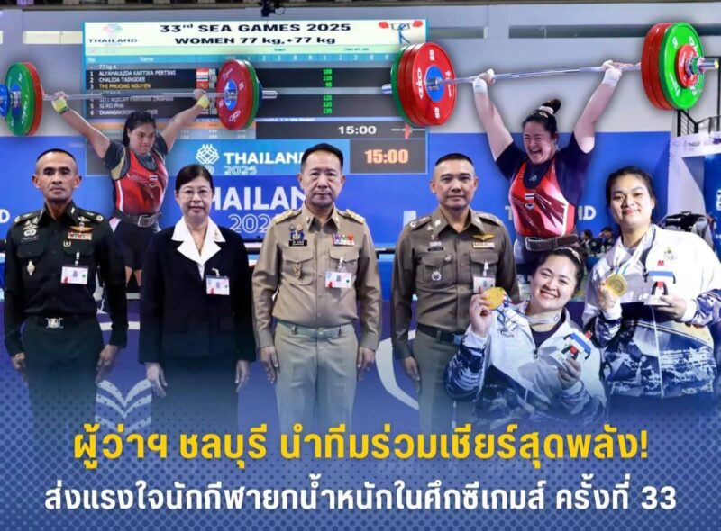 ผู้ว่าฯ ชลบุรีนำทีมร่วมเชียร์สุดพลัง! ส่งแรงใจนักกีฬายกน้ำหนักในศึกซีเกมส์ ครั้งที่ 33 ณ โรงเรียนกีฬาชลบุรีบรรยากาศการแข่งขันกีฬายกน้ำหนักในมหกรรมกีฬาซีเกมส์ ครั้งที่ 33 (33rd SEA Games 2025) ณ อาคารยกน้ำหนัก โรงเรียนกีฬาจังหวัดชลบุรีเป็นไปอย่างคึกคัก