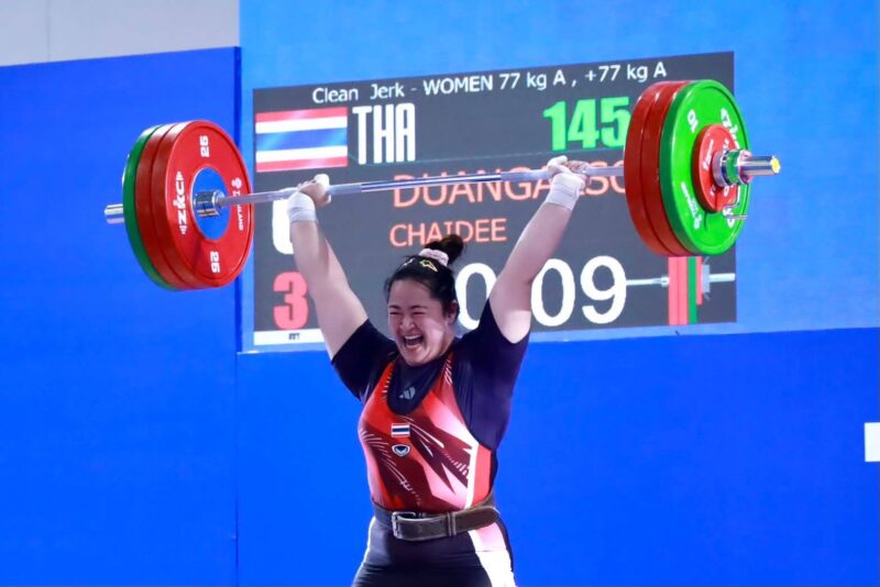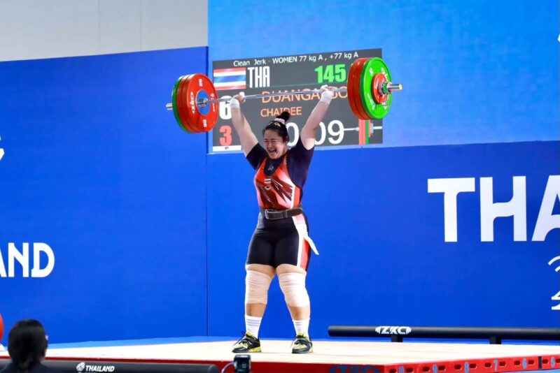 รุ่นมากกว่า 77 กิโลกรัม หญิง (+77 kg): ดวงอักษร ใจดี (Duangsakorn Chaidee) จอมพลังสาวไทยยังคงแข็งแกร่งคว้าเหรียญทองเพิ่มให้ทัพนักกีฬาไทยด้วยสถิติน้ำหนักรวม 258 กิโลกรัม