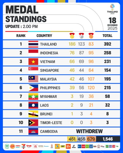 สรุปผลกีฬาซีเกมส์ช่วงบ่ายของวันที่ 18 ธันวาคม ถึงคิวทัพอีสปอร์ต Arena of Valor (AoV) ชาย ลงสนามชิงเหรียญทอง ส่วน ฟิลิปปินส์ คว้าทองเทนนิสหญิงตามคาด ด้าน “พายเรือมังกร” เป็น อินโดนีเซียเวียดนาม แบ่งกันคนละทอง ส่วนตารางเหรียญอัปเดท เวลา 14.00 น. ไทยนำ 186 ทอง ช่วงเย็นเหลือโปรแกรมชิงเหรียญอีกเพียบ!