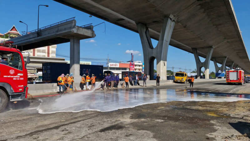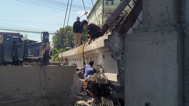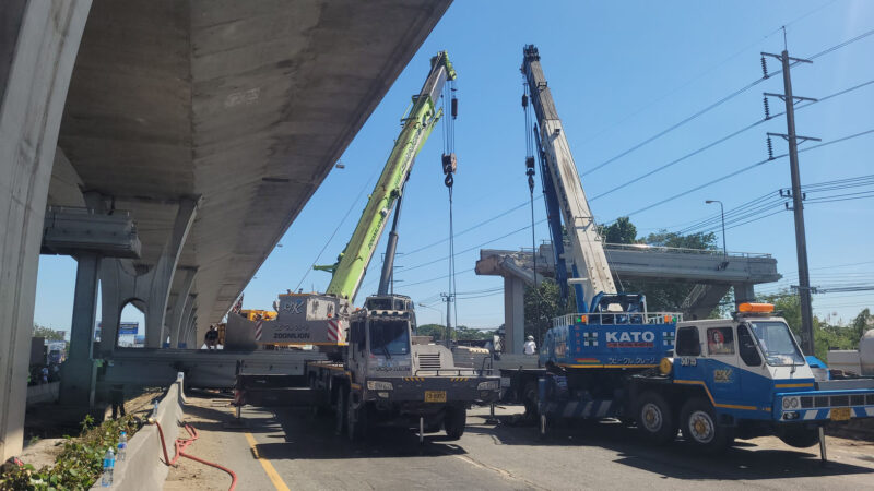 ความคืบหน้าล่าสุด เมื่อเวลา 15.00 น. วันที่ 18 ธันวาคม 2568 ผู้สื่อข่าวรายงาน เจ้าหน้าที่ต้องใช้รถเครนขนาดใหญ่จำนวน 4 คัน เพื่อยกคานปูนของสะพานลอยที่มีน้ำหนักจำนวนมหาศาล ยกออกจากตัวรถบรรทุกพ่วงและรถกระบะบรรทุกไข่ ก่อนจะยกคานสะพานลอยดังกล่าวเข้าไปไว้ยังร่องกลางของถนนเทพรัตน จากนั้นเจ้าหน้าที่ได้เร่งกวาดล้างทำความสะอาดพื้นถนน เพื่อเปิดการจราจรคืนตามปกติ