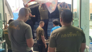 ทั้งนี้ สิ่งของทั้งหมดจะถูกส่งมอบผ่านทางเจ้าหน้าที่ทหารเรือ เพื่อนำไปกระจายความช่วยเหลือให้แก่ประชาชนในศูนย์อพยพและกำลังพลทหารตามแนวชายแดนในพื้นที่ต่าง ๆ อย่างเหมาะสม