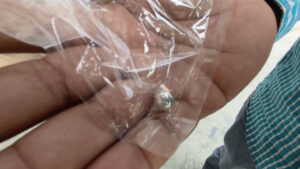 นอกจากนี้ นายเสนีย์ ยังนำหัวกระสุนที่พบตกอยู่ภายในบ้านมาแสดงต่อทีมข่าวเรา ลักษณะเป็นลูกปืนตะกั่วทรงกลม คล้ายลูกปืนรถจักรยาน ซึ่งได้เก็บรวบรวมใส่ถุงพลาสติกไว้เป็นหลักฐาน เพื่อส่งมอบให้พนักงานสอบสวน สภ.สำโรงใต้ ดำเนินการตามขั้นตอนของกฎหมาย