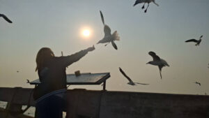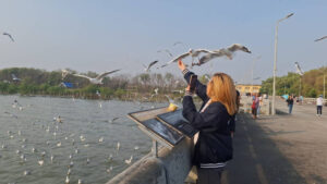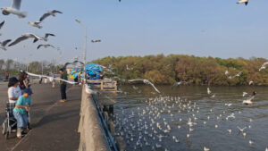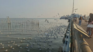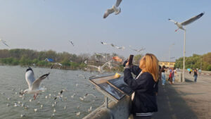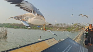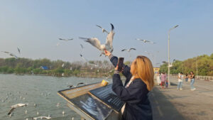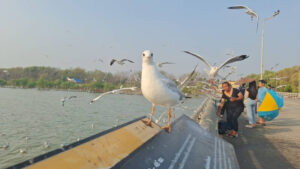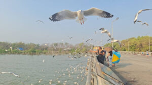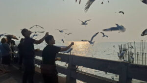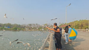 ก่อนวันหยุดสุดสัปดาห์ นักท่องเที่ยวแห่ชม-ให้อาหารนกนางนวลที่ตากอากาศบางปู เที่ยวบางปูใกล้กรุงเทพ