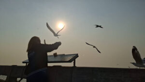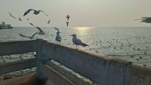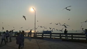ภาพบรรยากาศในช่วงเย็นของก่อนวันหยุดสุดสัปดาห์ ที่มีนักท่องเที่ยว ทุกเพศ ทุกวัย ที่เดินทางมาชมและให้อาหาร / นกนางนวล / ที่อพยพบินหนีหนาวมาจากแถบมองโกเลีย ทิเบต ไซบีเรีย และประเทศจีน มาหากินอยู่บริเวณชายทะเลอ่าวบางปู โดยพบนกนางนวลมากที่สุดอยู่ที่ สถานตากอากาศบางปู จังหวัดสมุทรปราการ ซึ่ง / นกนางนวล / จะบินหนีหนาวมาอย่างนี้ทุกปี ในช่วงตั้งแต่เดือนพฤศจิกายน ถึง เดือนเมษายน ก่อนที่จะบินกลับในช่วงกลางเดือนพฤษภาคม